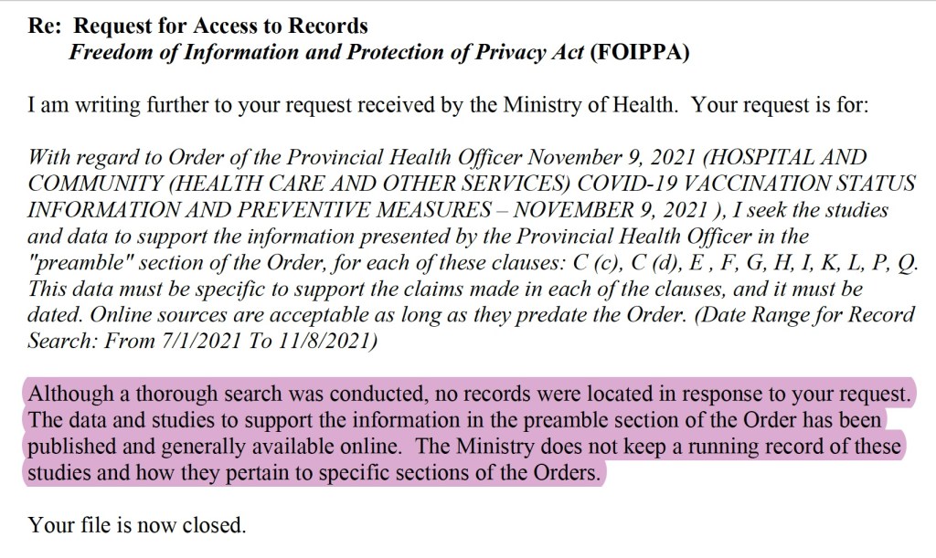 On November 22, 2021, Empty Boots made a request to the British Columbia Ministry of Health under the Freedom of Information and Protection of Privacy Act. The reply is given below. It appears that the BC Ministry of Health cannot provide information to substantiate its COVID-19 public health orders, specifically the mandatory vaccination aspect of the order of November 9, 2021, that cost at least 2,496 frontline workers their jobs in BC. Empty Boots filed a complaint with the Office of the Information and Privacy Commissioner, which found grounds for an official review, now underway. Please stay tuned.